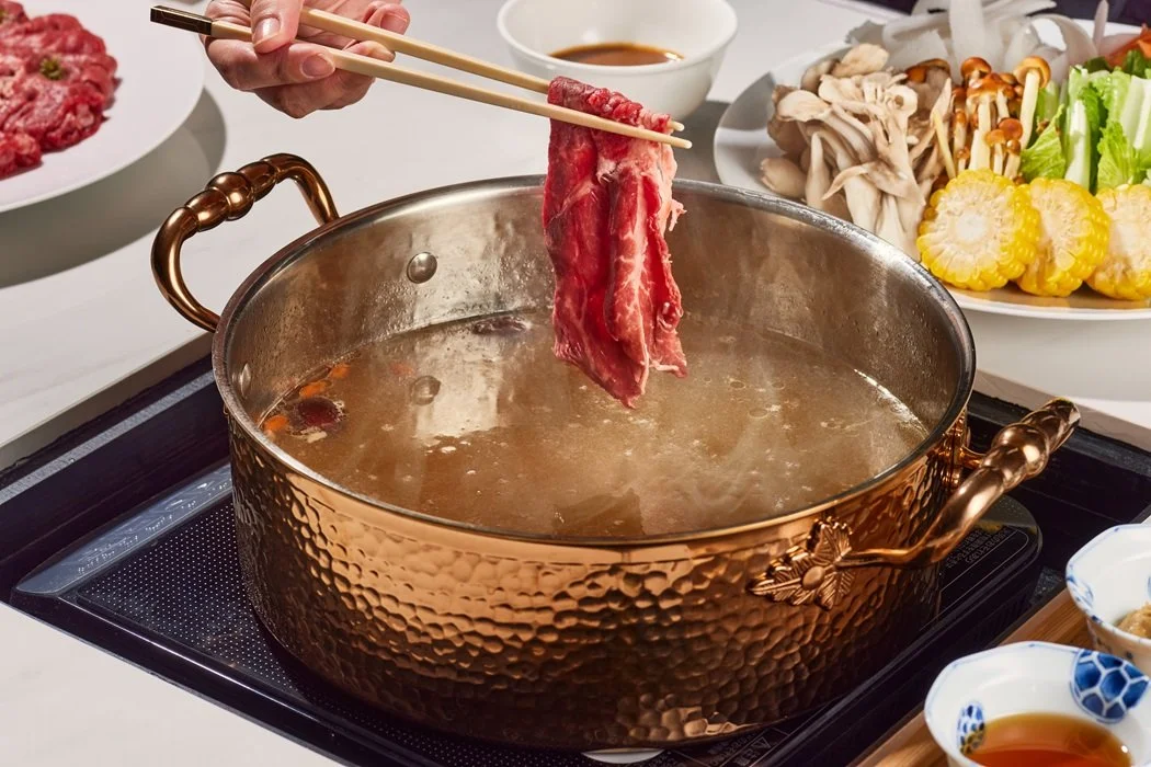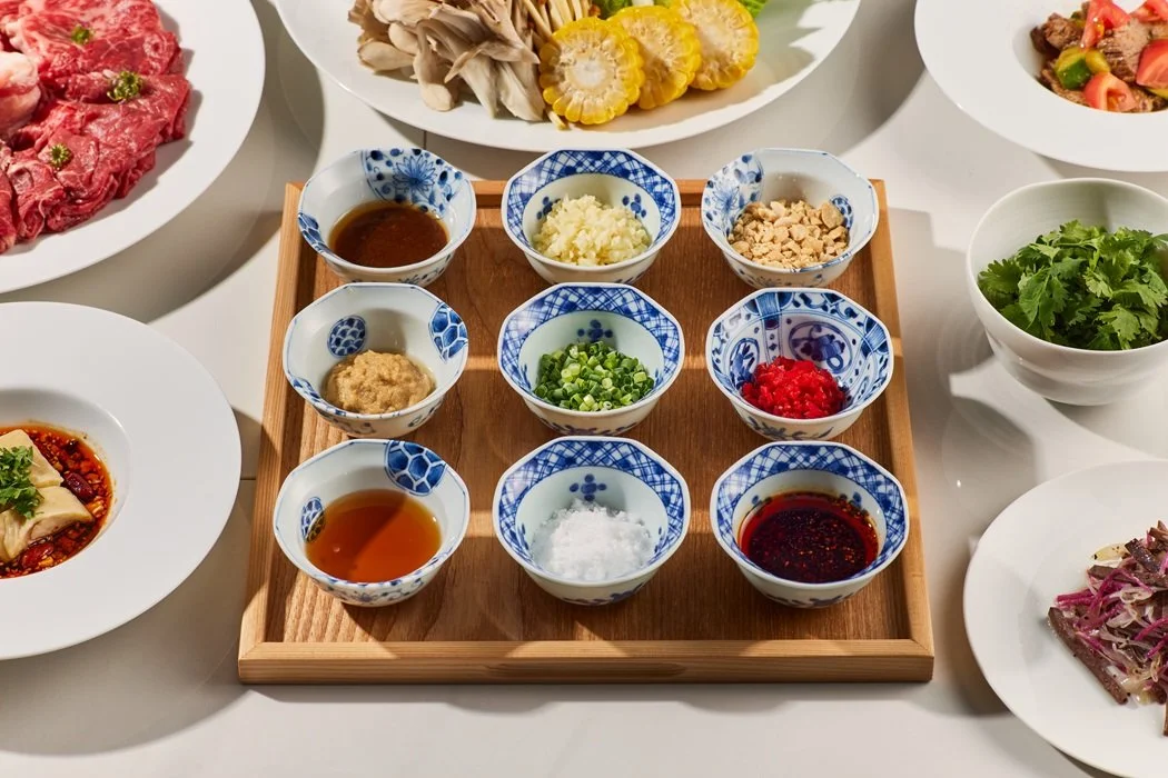 享用三种牛肉、鸡肉、猪肉、蔬菜和中华面,全部在牛骨汤底中烫熟。您可以根据自己的喜好,用各种佐料调配酱汁,享受独特风味。