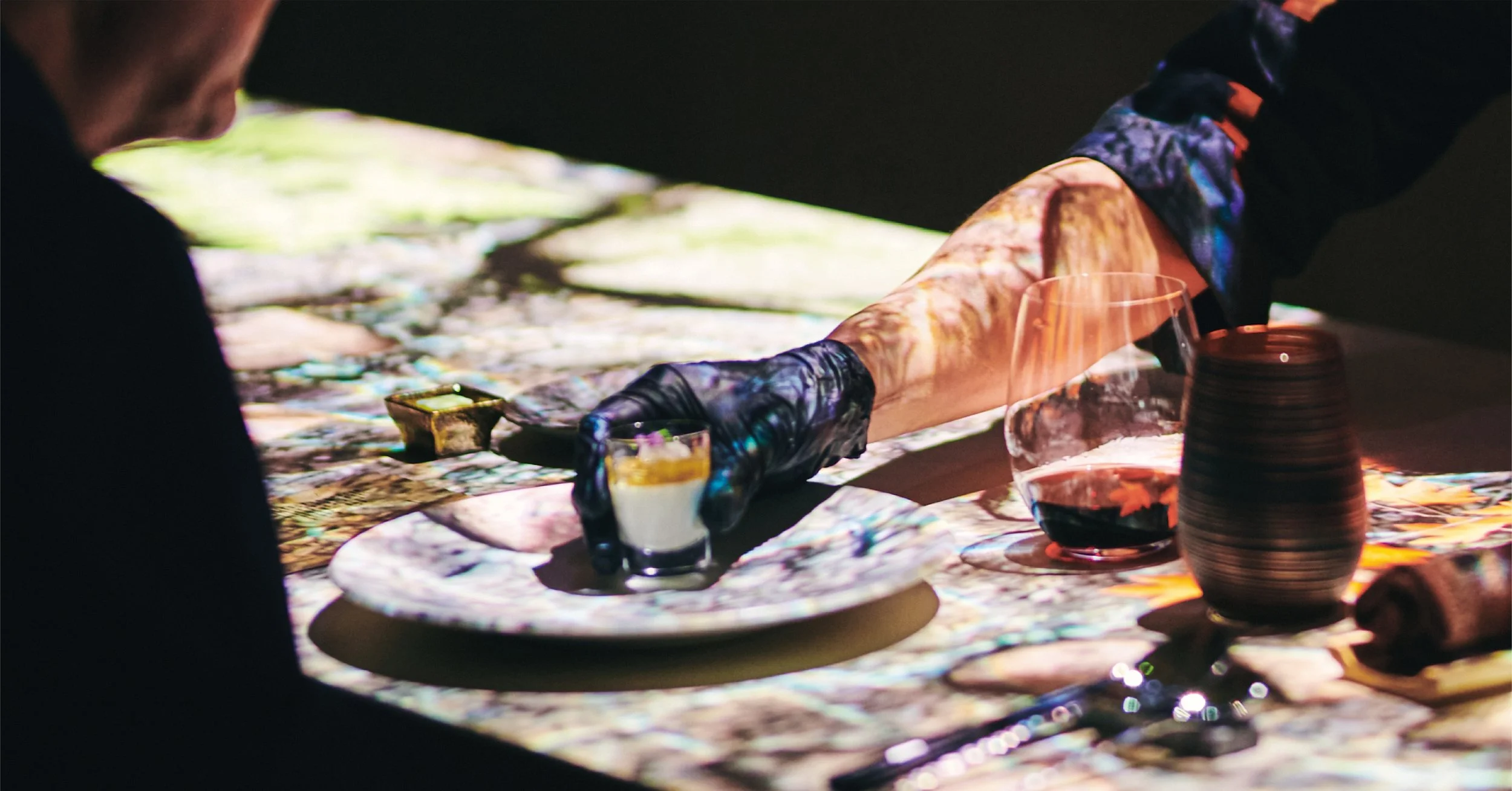 We cook local ingredients by using French and Japanese ways, and emphasize hospitality with the use of chopsticks and other Japanese cooking techniques. The restaurant is full of a live atmosphere, and the projection mapping that accompanies the food on the 18-meter counter is a highlight of the restaurant. The acoustics are also composed of actual natural sounds, allowing diners to enjoy a relaxing moment along with their meal.