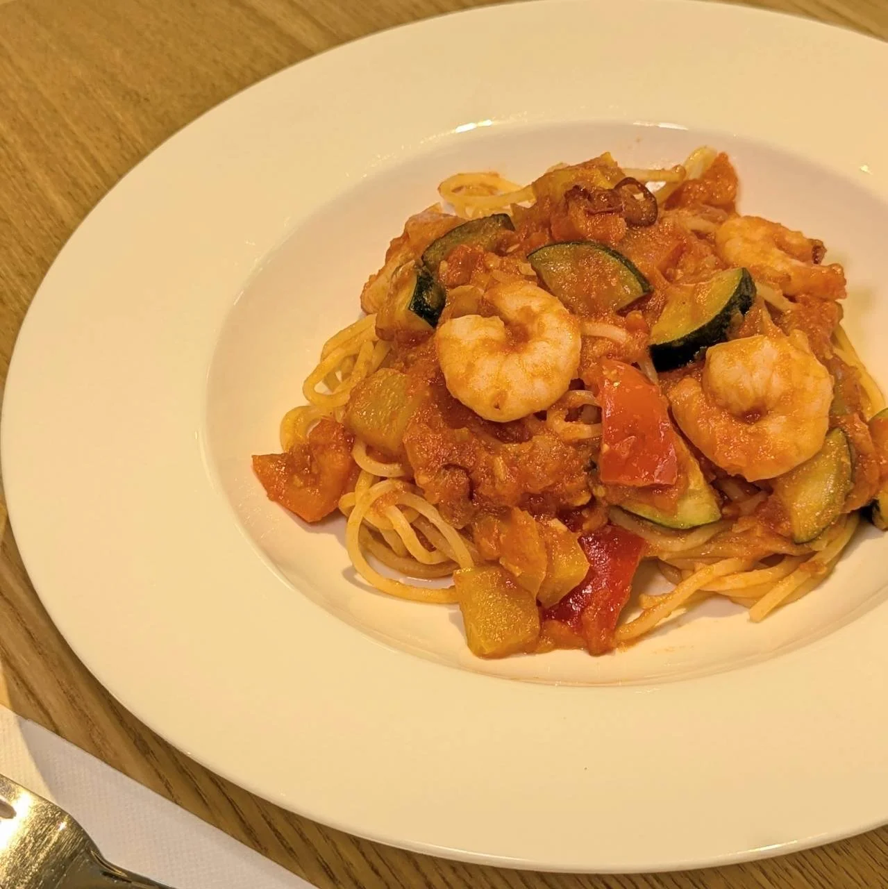 虾仁与夏季蔬菜的番茄酱鲜制意大利面