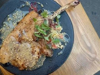 Juicy bone-in pork loin is grilled to perfection and served with an exquisite sauce.