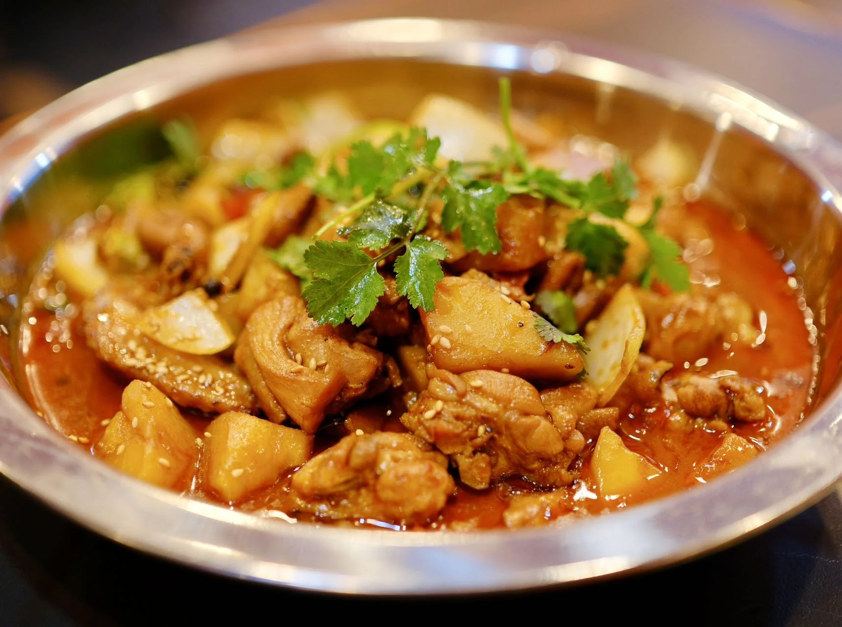 A famous large-plate dish from Xinjiang, China. Tender chicken and potatoes are simmered with rich spices, creating an irresistible aroma. Enjoy the flavorful sauce, and finish the dish by adding noodles.
