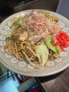 第一人气菜单! !炒面的丰富配料有猪肉、鱿鱼、虾、牛肉、什锦、煎蛋、泡菜等!