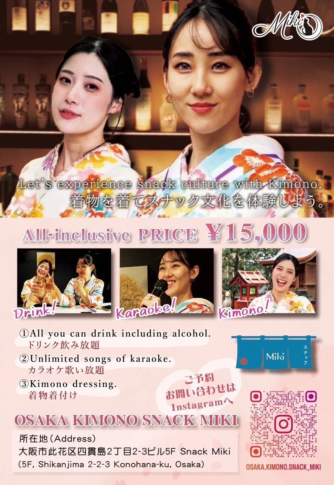 体验日本传统文化——穿着和服享受美酒!日本的饮酒文化非常多样,从居酒屋、酒吧到独特的小酒馆(Snack)。与英语中的“snack”不同,日本的小酒馆是一种舒适的饮酒场所,顾客可以在这里放松,与老板或其他客人交流,享受轻松的氛围和美酒。