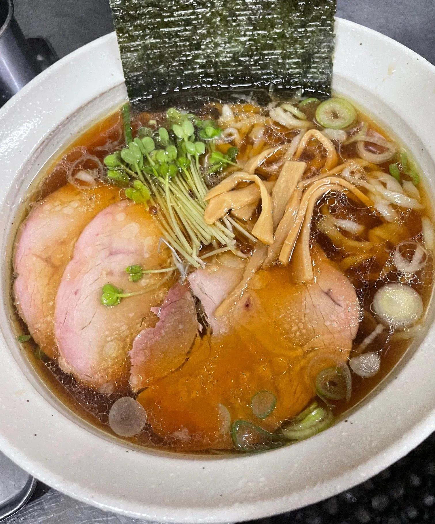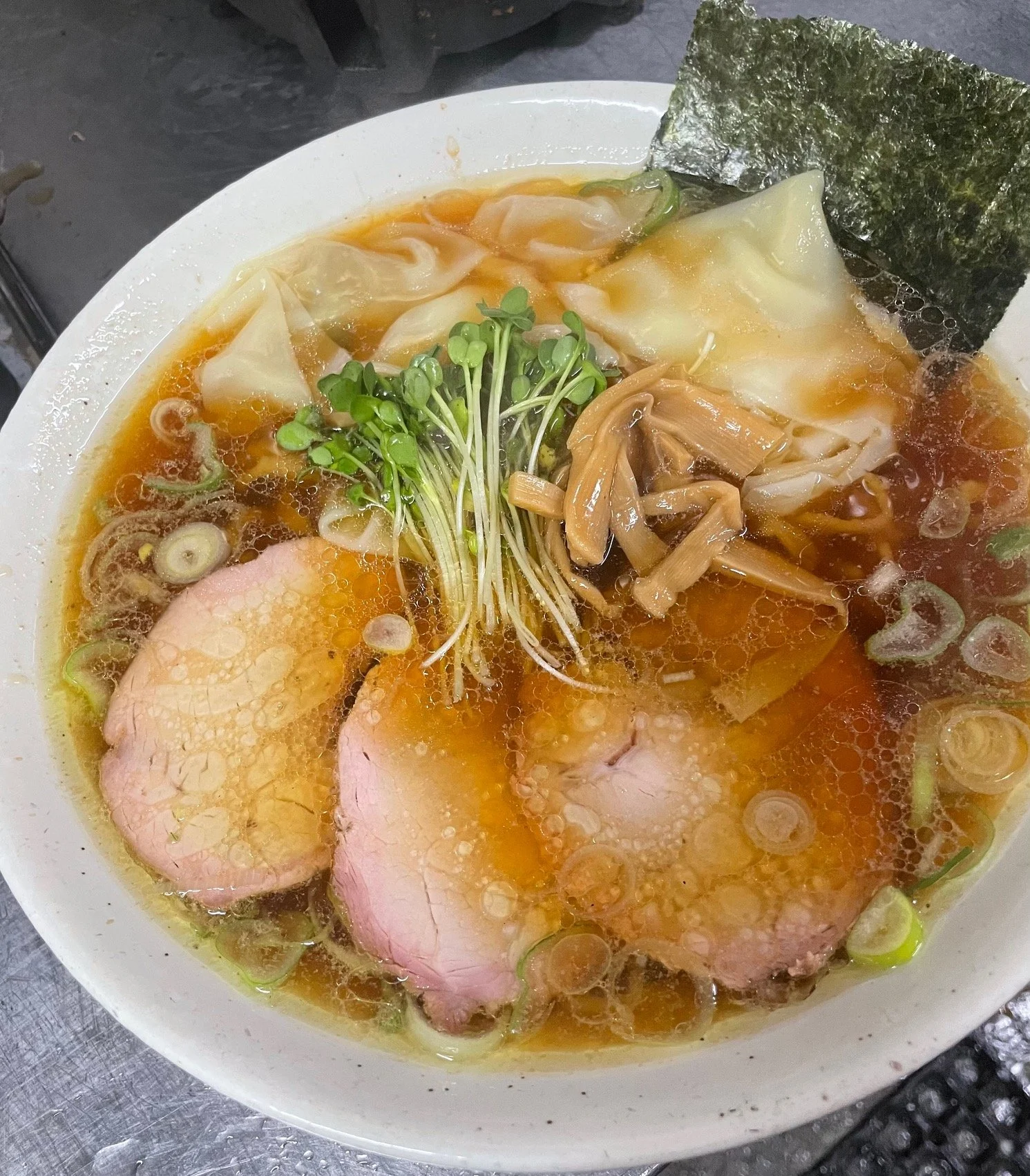 Ramen with Chinese-style noodles and richly stuffed wontons