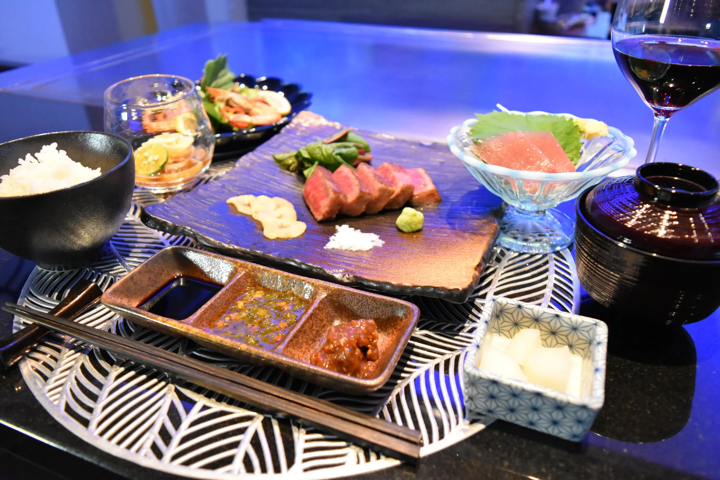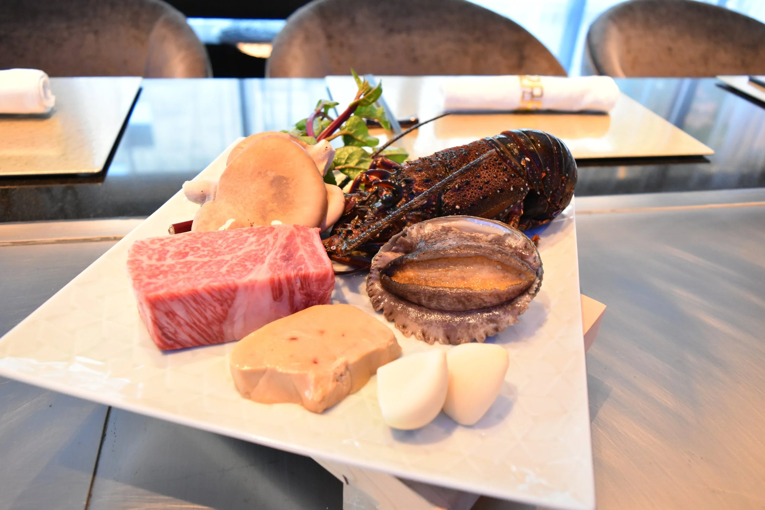 这里精选来自 日本各地的品牌和牛、新鲜的伊势龙虾,以及 当天采摘的岛蔬,由经验丰富的主厨在您面前精湛烹饪,让人目不转睛。