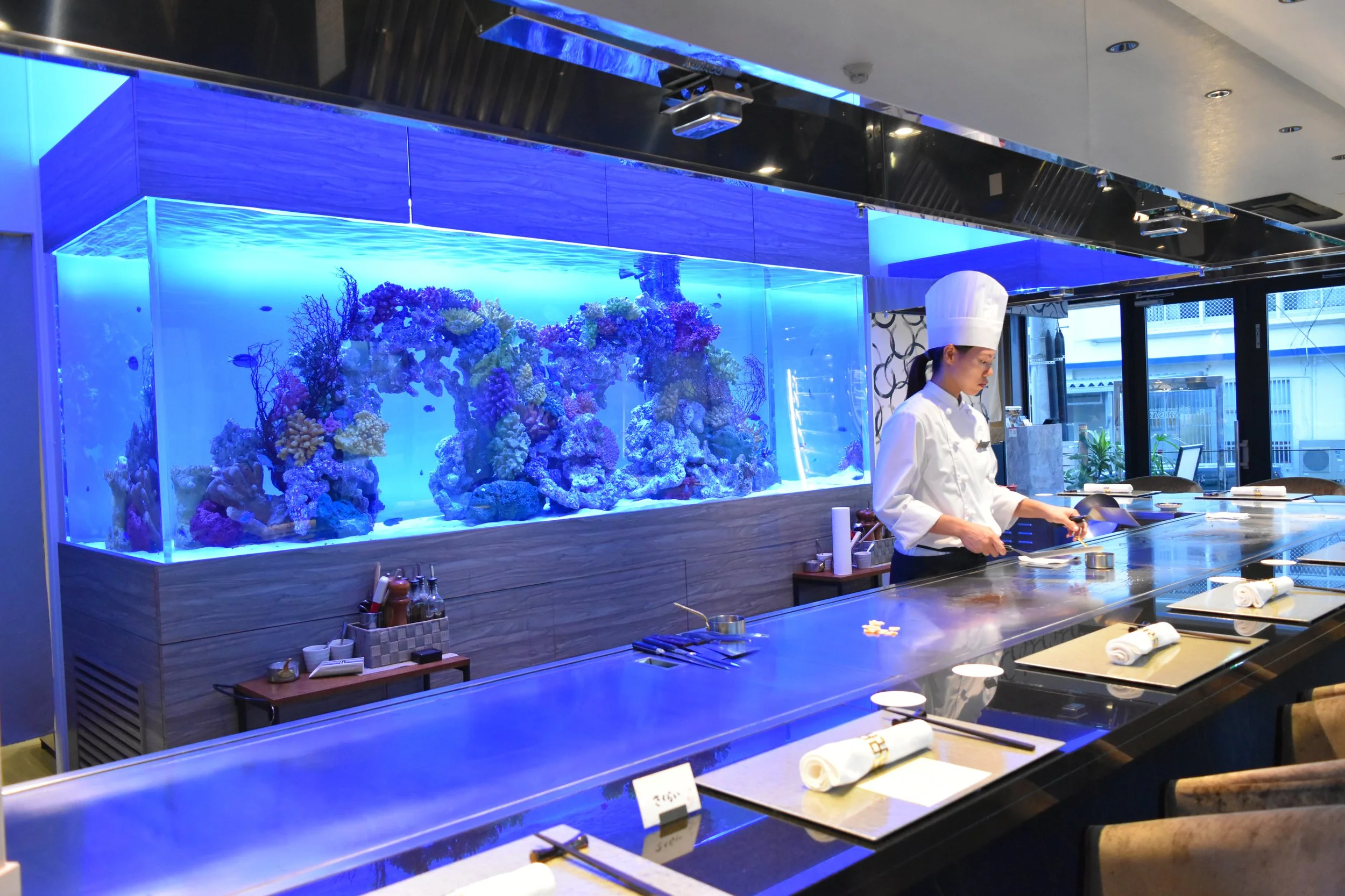 步入餐厅,仿佛置身于 冲绳海洋的大型水族箱梦幻空间,沉浸在 优雅的氛围 中,享受一场 无与伦比的美食盛宴。